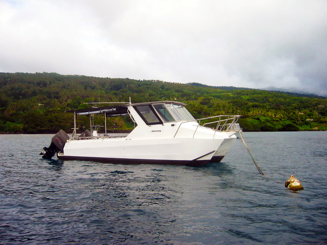 Our 8 meter (26-foot) custom aluminum dive boat, Ika Lailai (Tiny Fish), is powered by a 200 hp outboard engine. Ika Lailai is also fully shaded with ample dry storage, mahogany seating, and two convenient exit areas for backward roll entries.