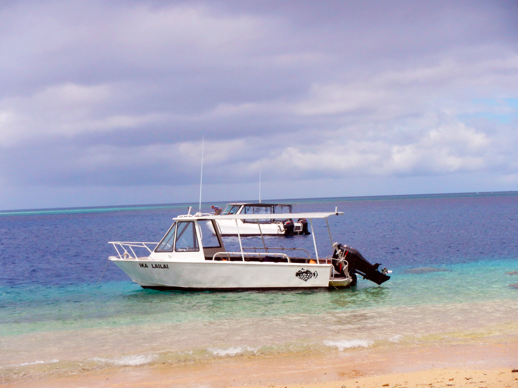 Our 12 meter (40 foot) custom aluminum dive boat, Super Fish, is powered by twin 200 hp outboard engines. Super Fish is fully shaded, built for comfort and is the only dive boat on Taveuni with a head (bathroom). Super Fish has four convenient platforms for entries/exits. Perfect for local two tank charters on the Rainbow Reef and also built for longer range voyages for advanced three tank charters to unexplored waters.